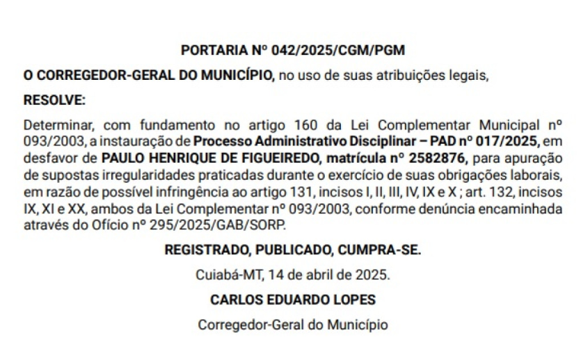 A Corregedoria-Geral da Prefeitura de Cuiabá instaurou processo administrativo disciplinar (PAD) contra o ex-vereador Paulo Henrique (MDB), que não conseguiu se reeleger nas eleições do ano passado. O procedimento apura suposto uso do cargo de servidor público para receber propina e vantagem indevida para favorecer organização criminosa. Ele é servidor público de carreira e ocupa a função de fiscal de meio ambiente na Secretaria Municipal de Ordem Pública (Sorp).